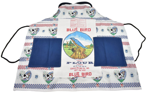 Every apron features an original Blue Bird flour sack on the front. Blue Bird flour, produced in Cortez, CO, is used widely on the Colorado Plateau. Due to its high gluten content, the flour is a preferred staple for making tortillas, frybread, and baked goods.