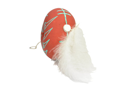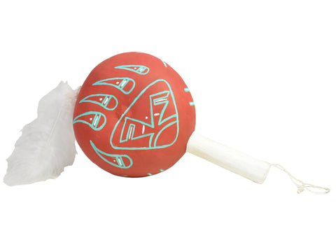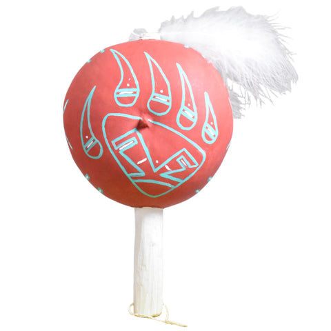 Materials: Hand painted Gourd, Cottonwood, Feathers, Yarn