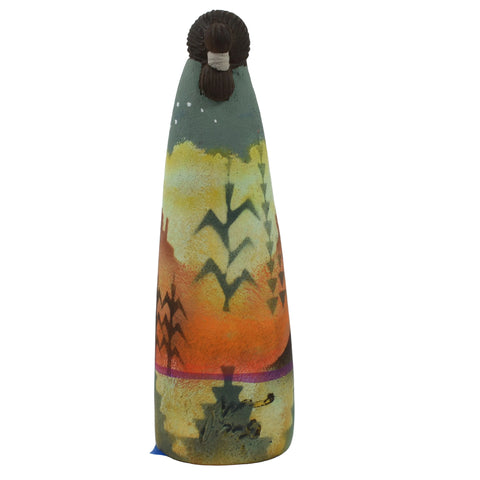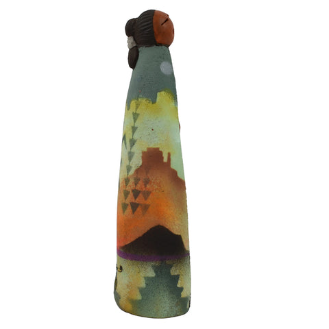 About the Artist: John C. Whiterock, a Diné potter, lives in Tonalea, AZ. His mother made traditional pottery, a skill she had learned from her mother-in-law before teaching John and his brother. John's figurines represent his female relatives performing daily rituals in Diné life. He makes the smaller pieces from thick, hand-rolled clay cylinders and builds the larger ones with clay coils. He carves the clay into figurines, which dry for up to two weeks before being kiln-fired, smoked with pine pitch, and painted.